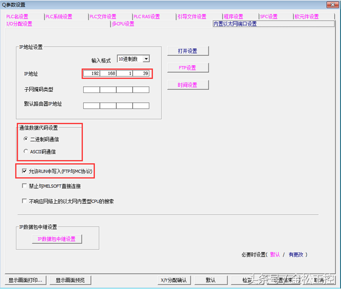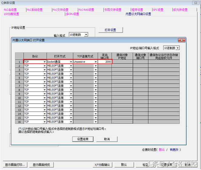 我们知道三菱Q系列PLC做以太网通讯有两种选择,第一种是使用带内置以太网接口的CPU,另外一种是加以太网模块QJ71E71-100。以太网模块QJ71E71-100虽然功能强大,但是额外加模块成本肯定高些。如果使用内置以太网接口能搞定就两全其美了。 内置以太网支持MC和套接字两种通信功能。当PLC作为从站时,计算机或显示器等通过MC协议可对CPU模块软元件进行读写。当PLC作为主站时,就需要使用套接字功能了。今天主要主要说的就是套接字功能的使用方法,详细操作步骤如下所示: Ø 设置PLC的IP地址