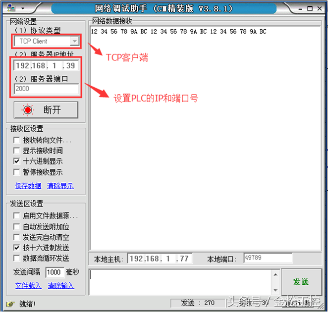2、以太网调试助手设置 协议类型:TCP Client ;IP地址和端口号对应PLC的设置