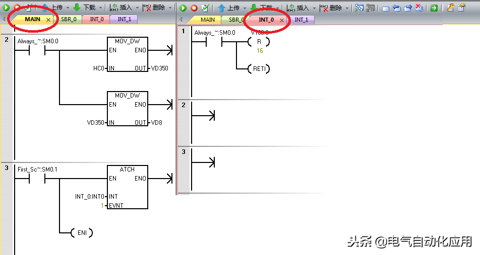 程序讲解,中断事件1为PLC扫描到I0.0下降沿,检测到该下降沿后暂停执行MAIN程序,而是直接执行INT0中断程序,在中断程序中,可以加一些对于该事件的处理,在中断程序执行后再返回到MAIN程序继续执行。 2 对于时间中断则更简单一些。时间中断大家可以理解为可以设定扫描时间的子程序。 西门子S7-200SMART共有两个时间中断,事件10和事件11。扫描时间由SMB34和SMB35设置。