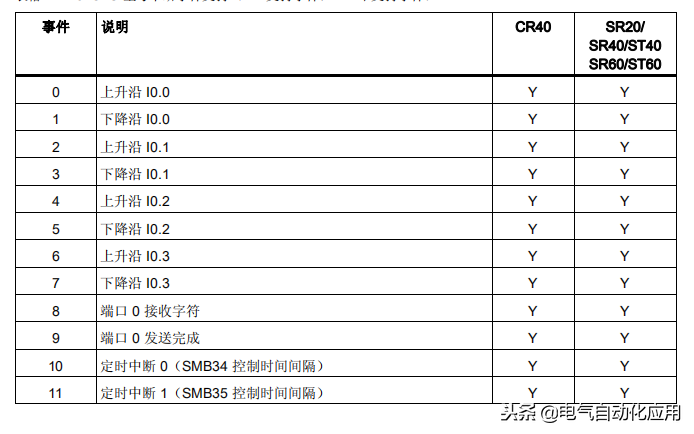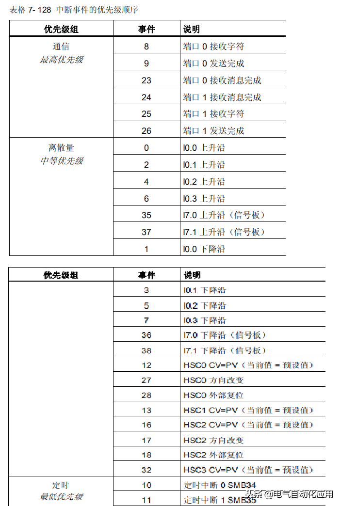 上图是松下伺服驱动器与PLC通讯的方式,因为数据的重要性,需要多次接受和发送数据进行校正。而这一过程对于时间的要求就很严格。所以虽然PLC的正常扫描周期也不长,但如果不使用中断的话很难保证其工作正常。 再有就是对于一些安全装置的设计,在一些特定场合,需要对安全装置,比如说急停按钮,光栅等进行快速的处理,而不是将它们写在通用程序里循环扫描。 除此之外还有一些系统特定功能的中断,也可以通过中断进行处理等等。 最后就是一些特定程序不需要扫描时间那么快,这种是时间中断,比如说PID的程序必须写到时间中断里。 以上就是西门子PLC的常见中断。 二其次是中断的优先级,中断为什么有优先级? 因为与可能会同时触发两个中断,那么哪个更重要一些呢?  西门子S7-200smart系统中断优先级顺序