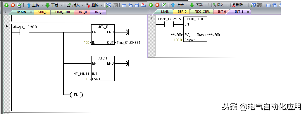 首先将SMB34设定时间,然后事件10启动中断程序INT1。 在中断子程序里,可以写一些程序,里面的程序就按照100ms的执行时间进行工作。 切记时间中断里面不需要写返回程序。