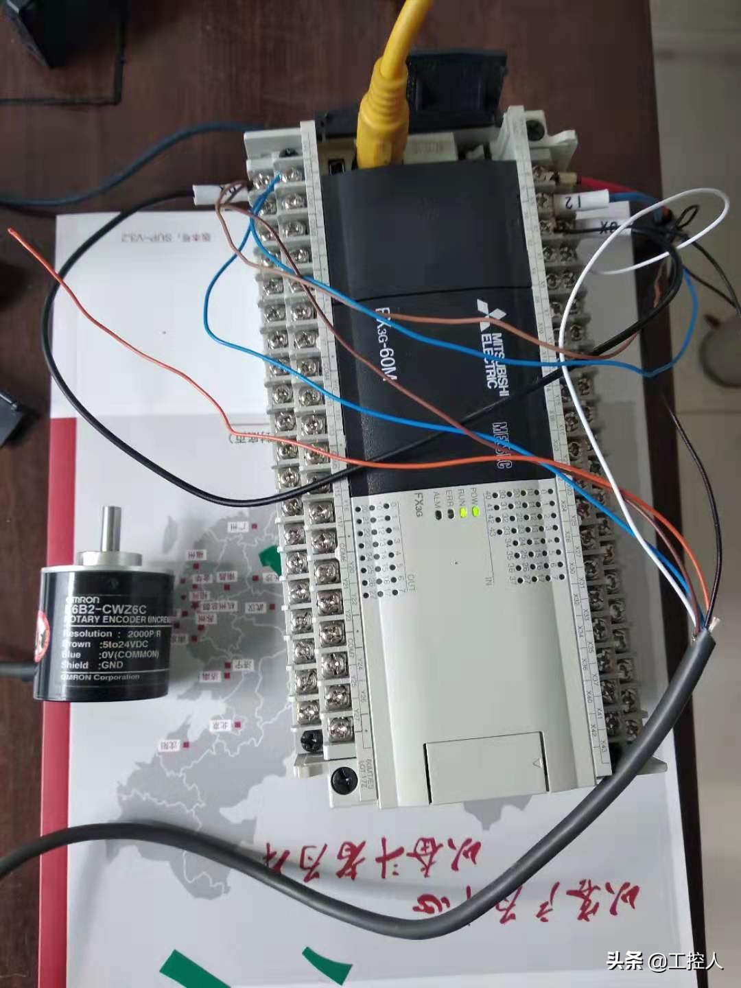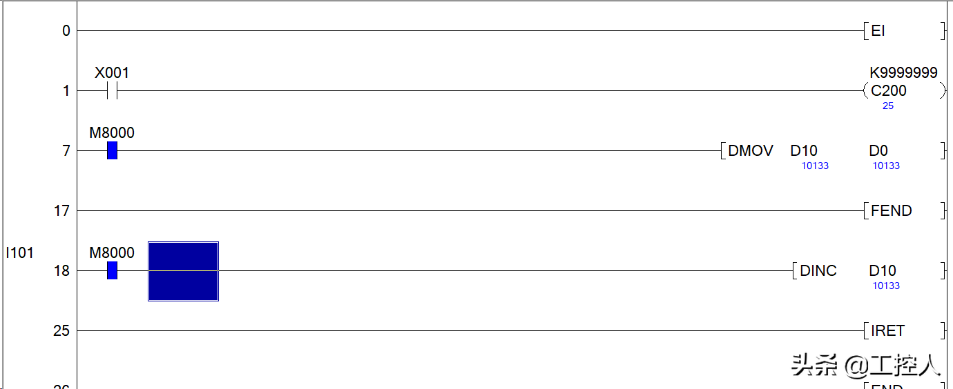 我们采用分辨率为2000p/r的编码器进行计数,我们分别用普通计数器C200和经过中断处理的X1对编码器进行计数,我们产不多转了5圈编码器,发现采用C200的计数结果是25,经过中断处理后的计数是100039,相差这么大,这下可以看到中断的功能了吧。这里我们在说下中断的用法,上面的梯形图是对输入X1进行中断,EI表示允许中断、FEND表示主程序结束,IRET表示中断返回。从EI→FEND这之间是主程序,从FEND→IRET表示中断子程序。当检测到X1上升沿之后进入中断子程序,然后返回主程序。编码器转一圈,X1有2000个上升沿,由于子程序只执行一次就返回主程序,因此D0就进行了2000次的+1。  编码器计数