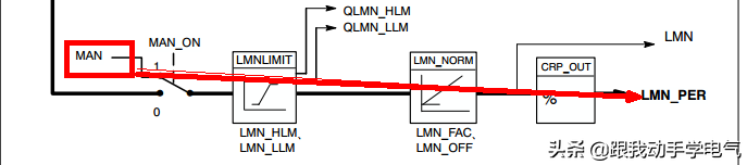 (7)LMN_PER:模拟量输出,也可以称之为输出标准化,可以直接连PQW,数据格式W#16#0000。 LMN:为real值输出,需要进行FC106转化到PQW。 1、模拟手自动切换功能,当MAN_ON为1,看输出是否等于MAN。