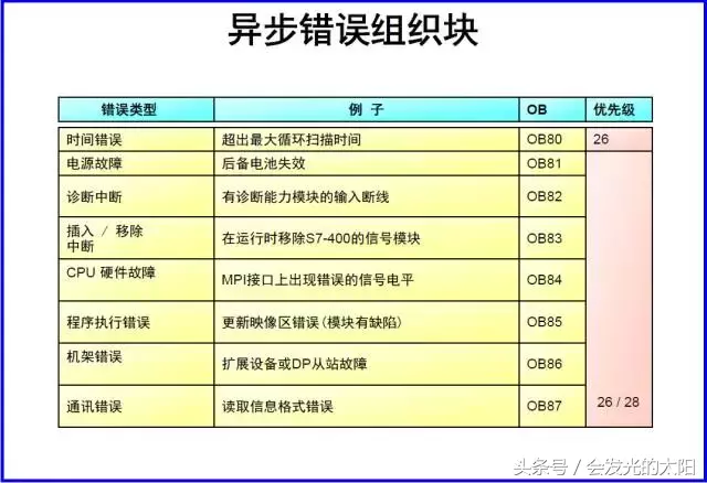 (9)几个组织块可以具有相同的优先级,当事件同时出现时,组织块按事件出现的先后顺序触发,如果超过12个相同优先级的OB同进触发,中断可能丢失。