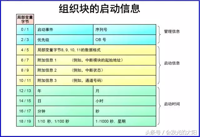 (4)每个组织块都有20个字节的局部变量,其中包含OB的启动信息。这些信息在OB启动时由操作系统提供,包括启动事件、启动日期与时间,错误及诊断事件。