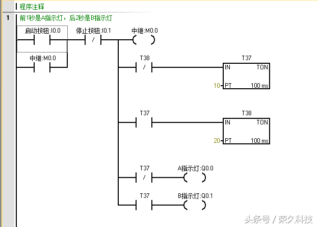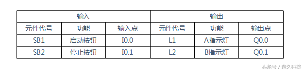 二、学习项目过程 1、项目要求,利用定时器实现俩灯交替闪烁。 当按下启动按钮I0.0时,A指示灯Q0.0亮一秒后熄灭,B指示灯Q0.1亮2秒后熄灭,如此循环,当按下停止按钮I0.1时,Q0.0和Q0.1停止输出。 2、项目分析 因为Q0.0亮1秒后熄灭,Q0.1亮2秒后熄灭,这里面有俩个定时时间,所以在PLC程序设计中我们可以选用2个TON定时器,分别是T37和T38控制接通时间,T38控制断开时间。 3、项目设计: 第一步:确定PLC的I/O地址分配