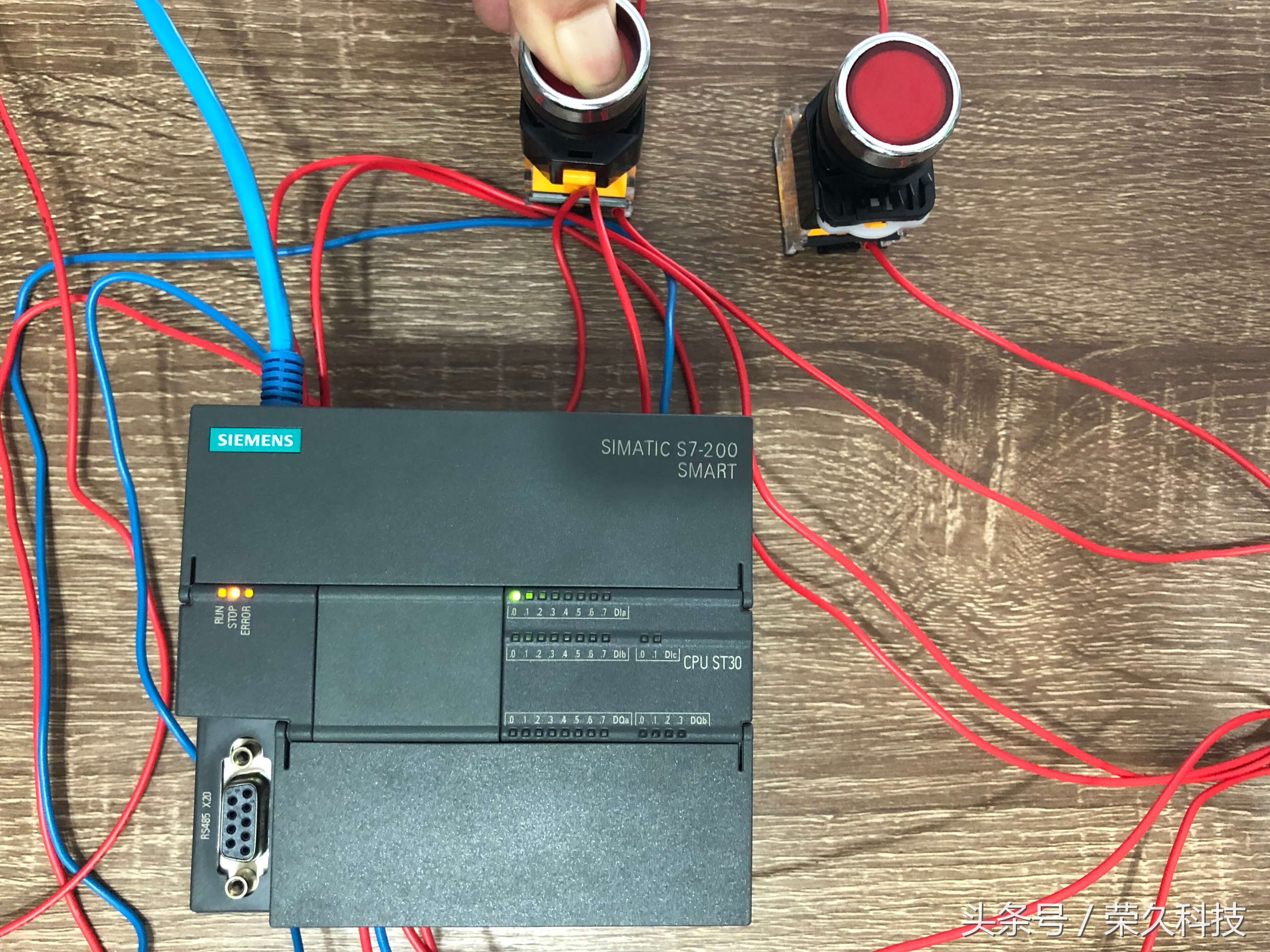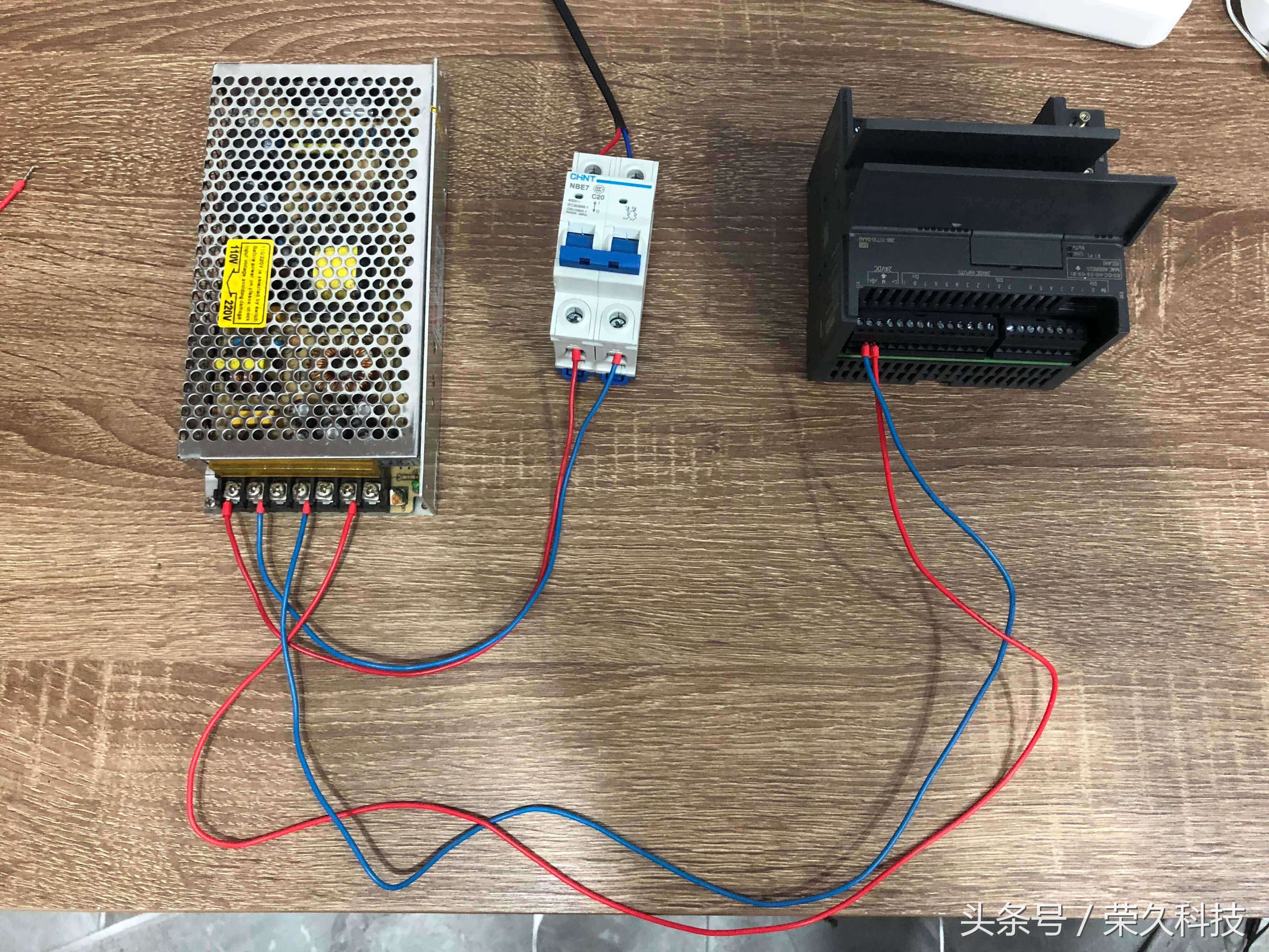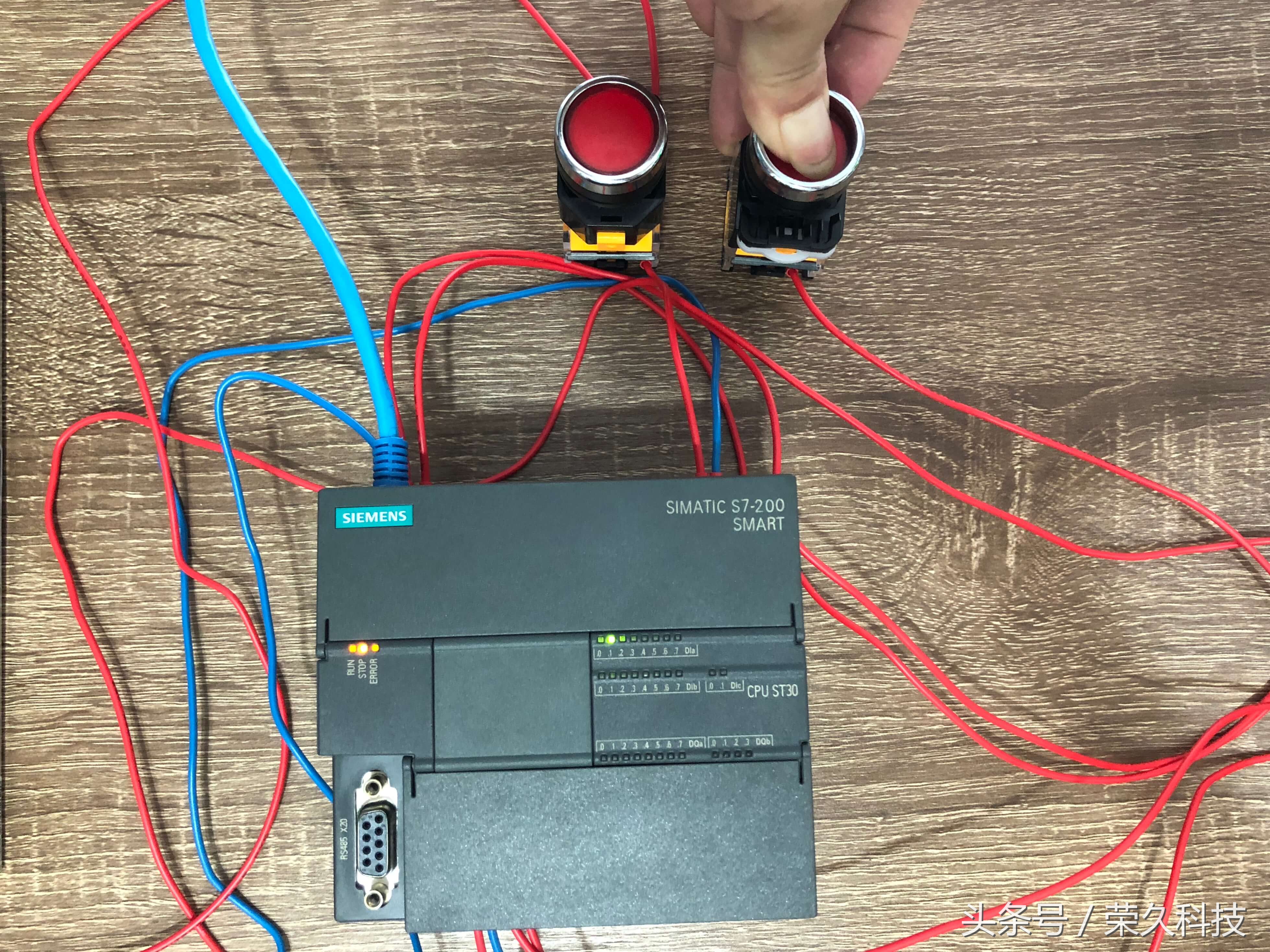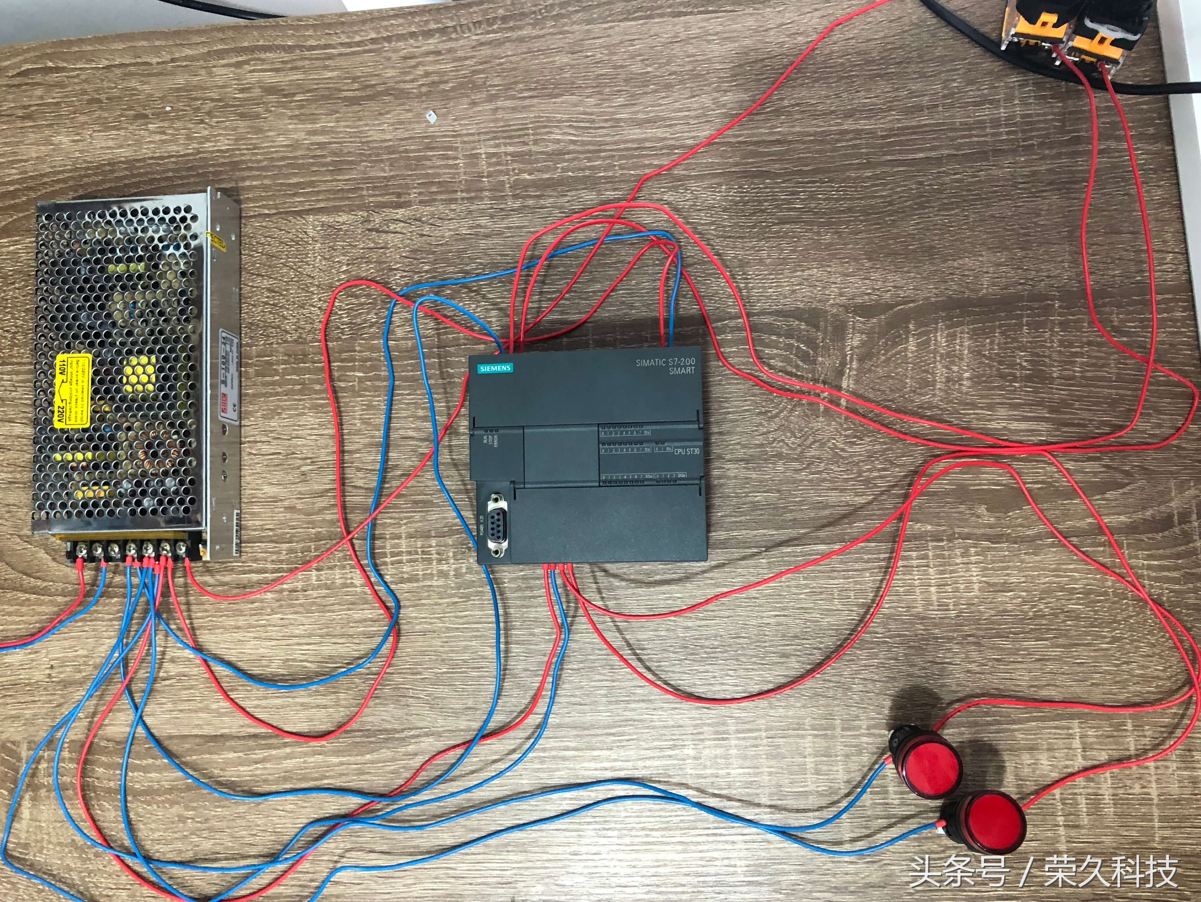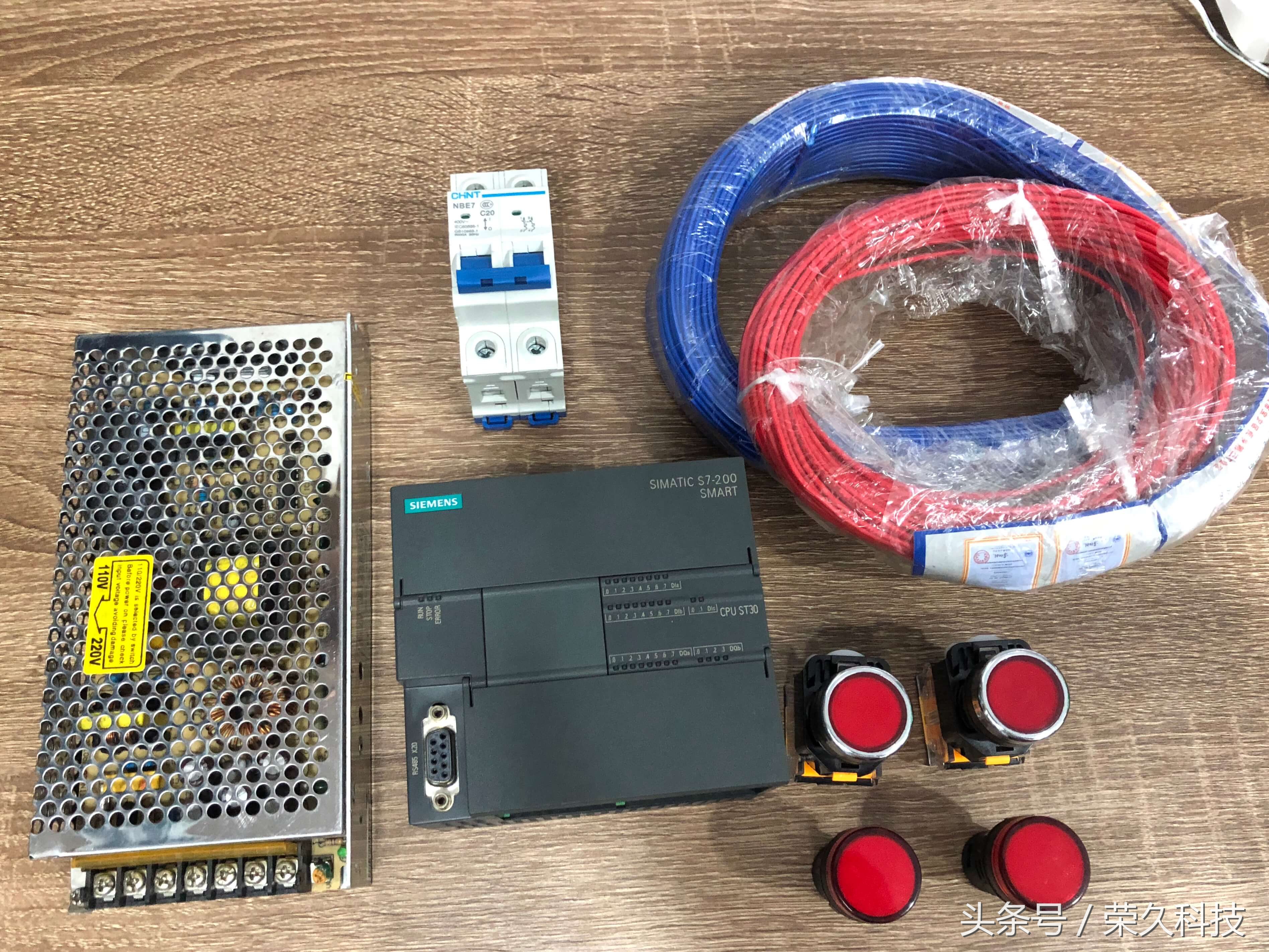 今天我们来教一个实操项目:利用PLC控制技术的实际应用过程,学习和掌握定时器指令的程序设计。 项目重点:了解PLC完成具体项目设计的方法及步骤,掌握PLC的梯形图程序设计。 一、所需要的实物教材 1、西门子S7-200 Smart CPU ST30 PLC 1块 2、按钮开关2个,指示灯2个,开关电源1个,小型断路器1个,路由器及导线若干。