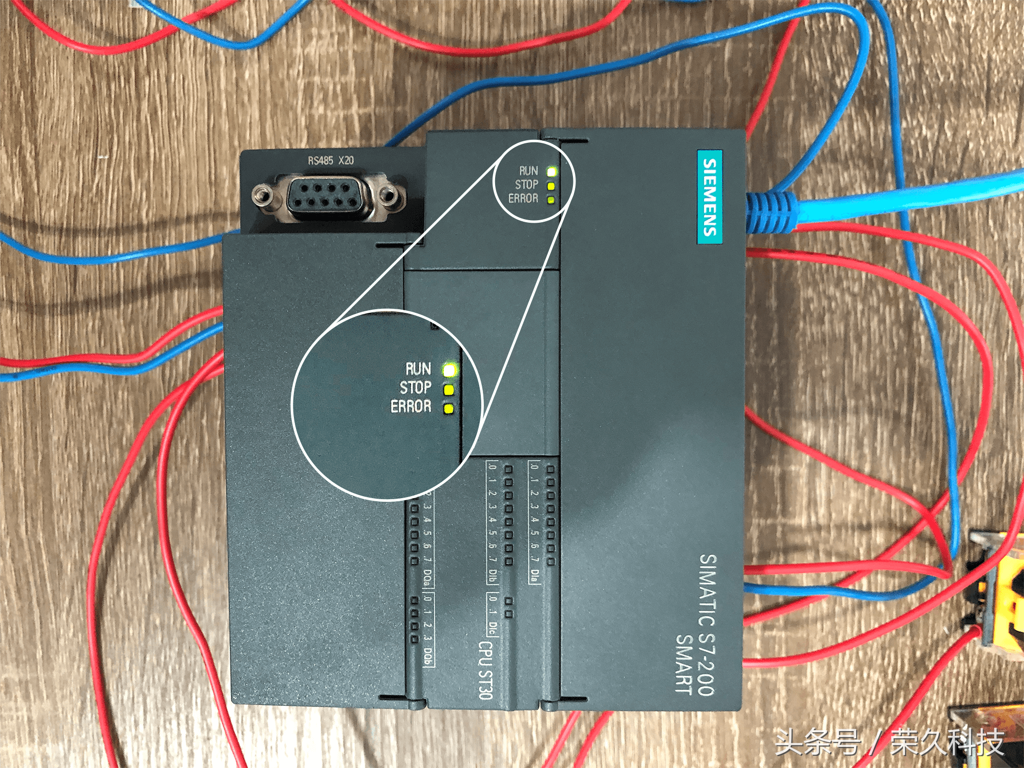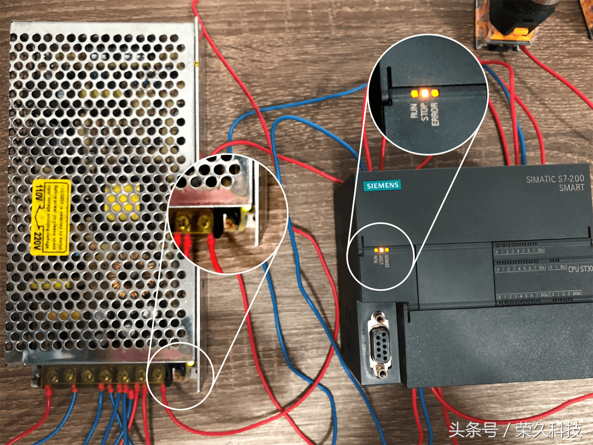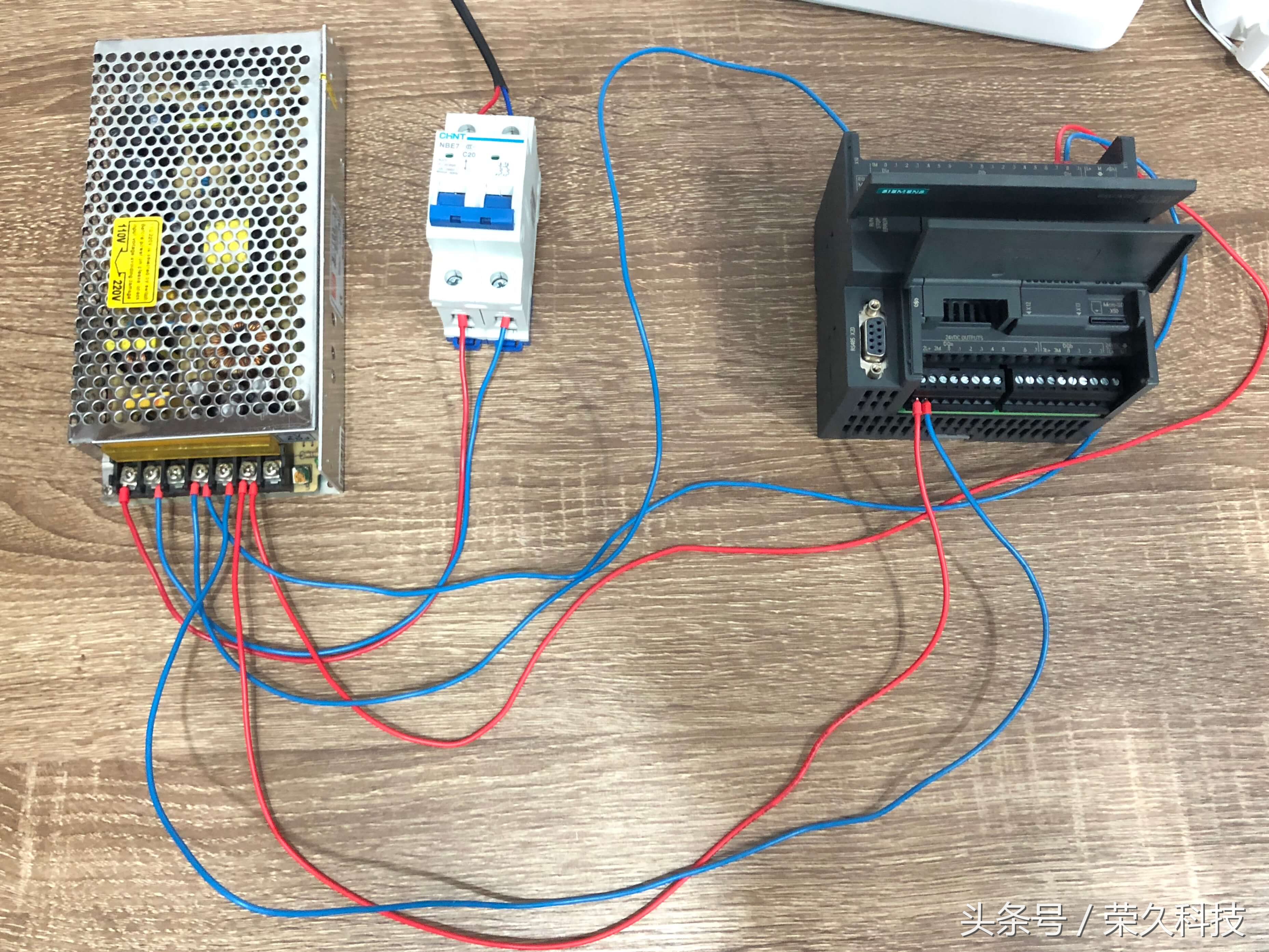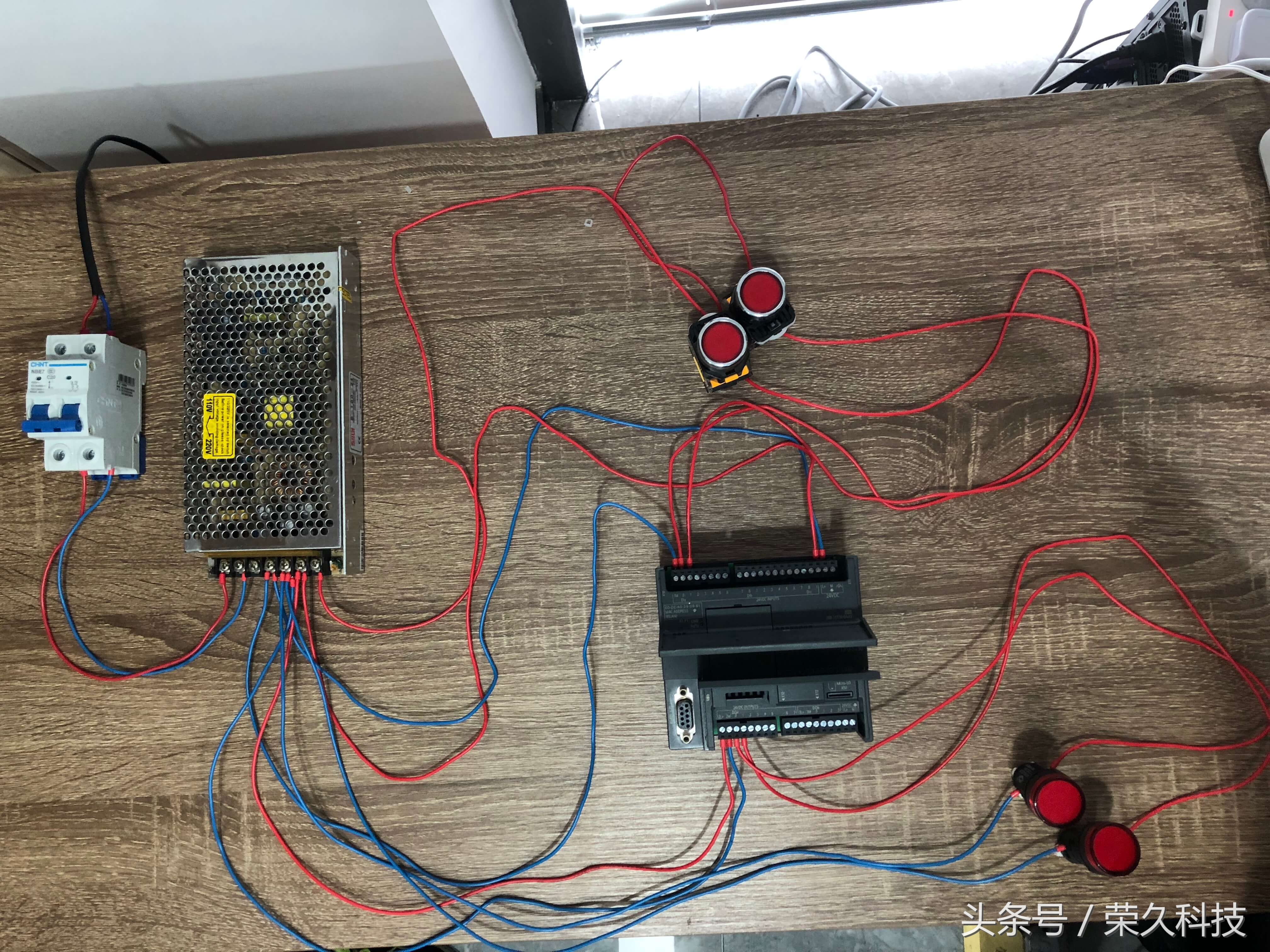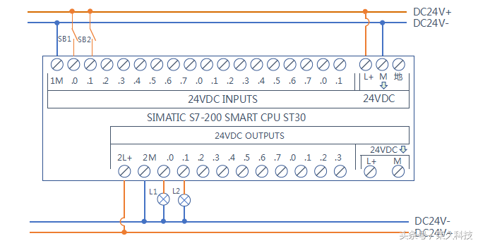 今天我们来教一个实操项目:利用PLC控制技术的实际应用过程,学习和掌握定时器指令的程序设计。 项目重点:了解PLC完成具体项目设计的方法及步骤,掌握PLC的梯形图程序设计。 一、所需要的实物教材 1、西门子S7-200 Smart CPU ST30 PLC 1块 2、按钮开关2个,指示灯2个,开关电源1个,小型断路器1个,路由器及导线若干。