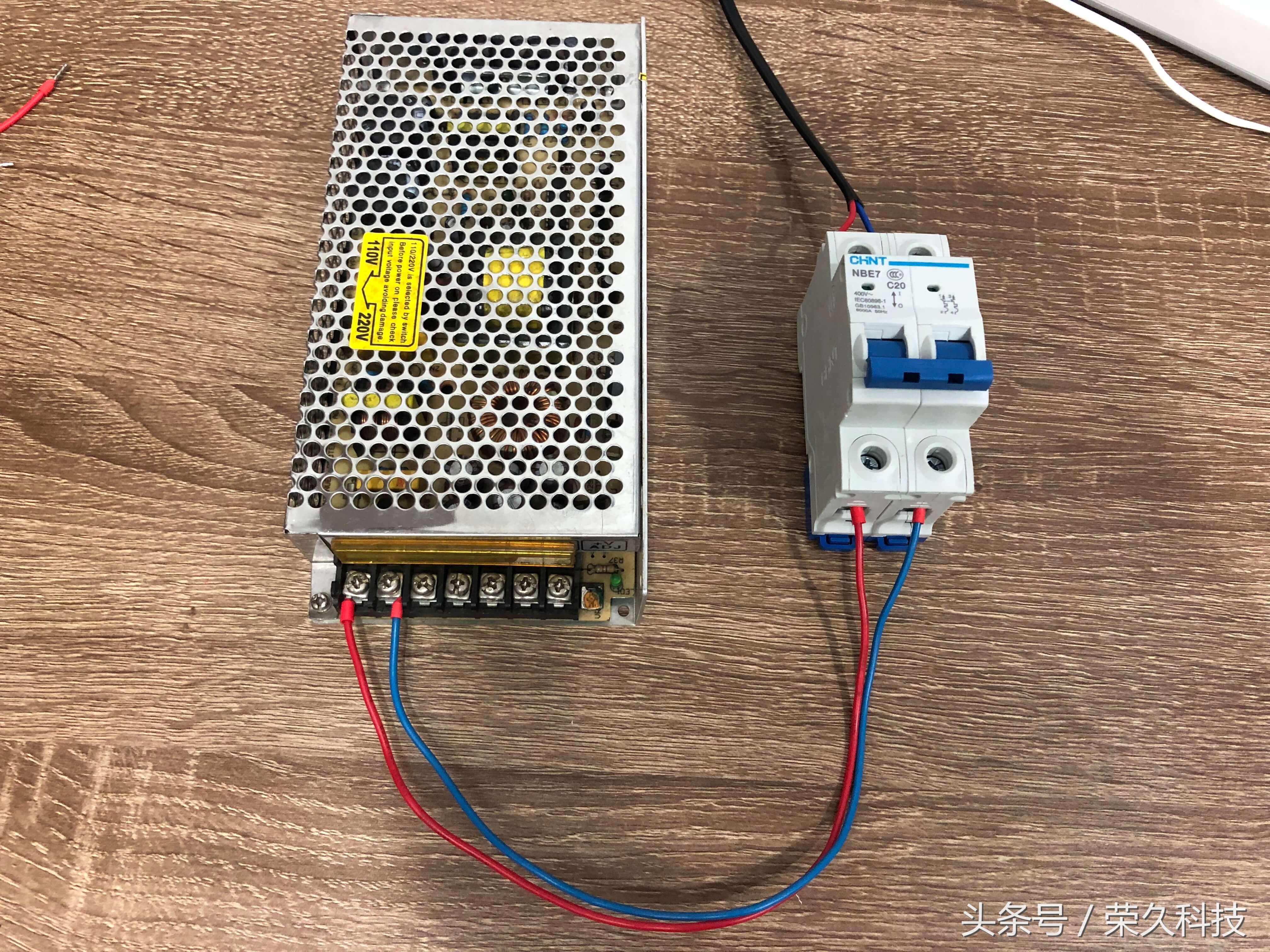 实物接线图 1、先接空气开关,起到保护作用,再从空气开关接到开关电源,用220伏的交流电源。