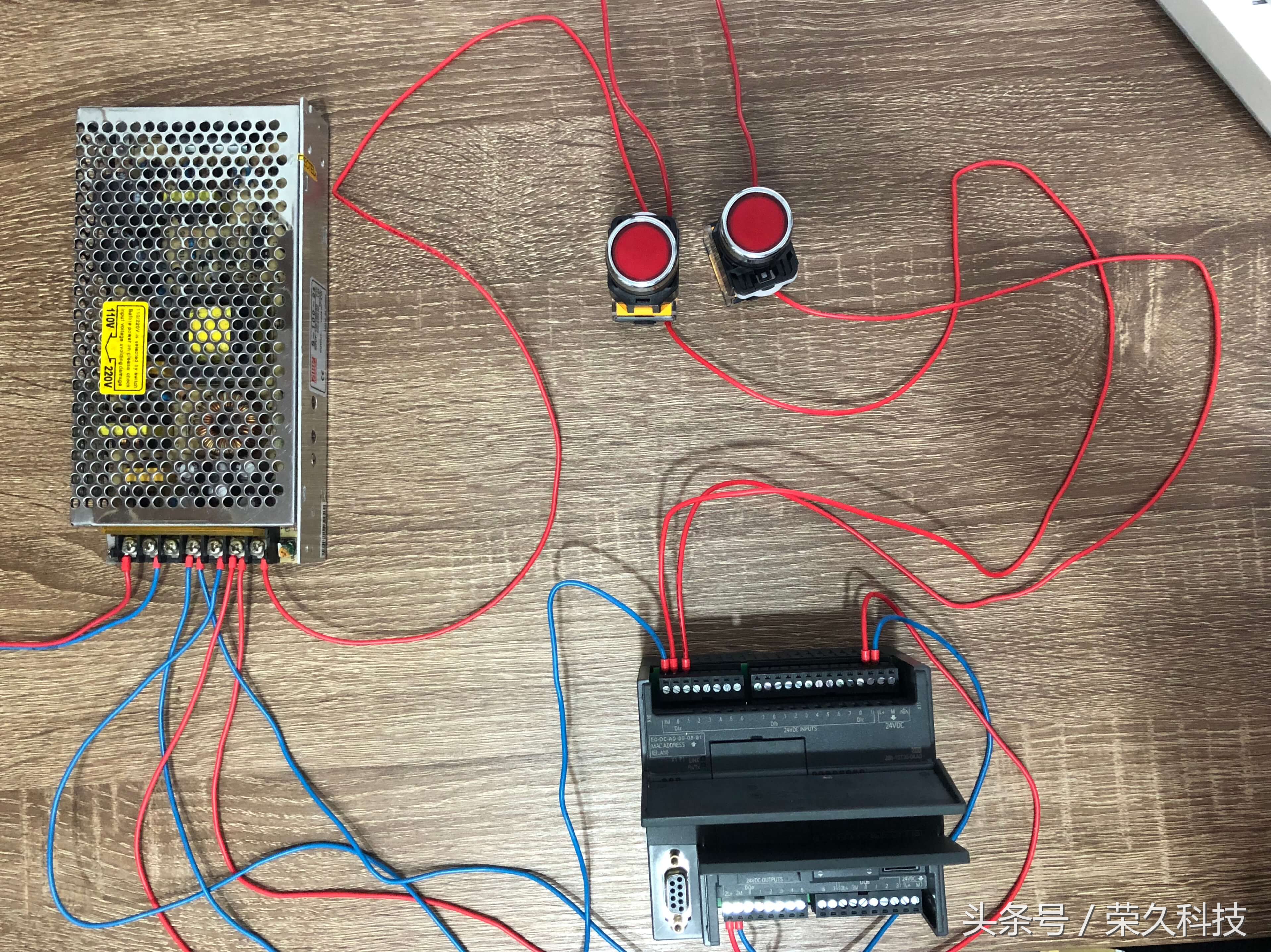 4、两个按钮 将按钮的常开触点用导线接到PLC的输入端子,根据上面的IO表,现在接入到I0.0端,再将按钮的常开触点接入到电源的正极。 另外一个按钮的常开触点用导线接到PLC的输入端,根据上面的IO表,现在接入到I0.1端,再将按钮另外一端接到24伏的正极。