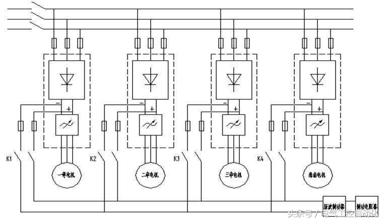 我们知道通常意义上的异步电动机多传动包括整流桥、直流母线供电回路、若干个逆变器,其中电动机需要的能量是以直流方式通过PWM逆变器输出的。在多传动方式下,制动时感生能量就反馈到直流回路。通过直流回路,这部分反馈能量就可以消耗在其他处在电动状态的电动机上,制动要求特别高时,只需要在共用母线上并上一个共用制动单元即可。