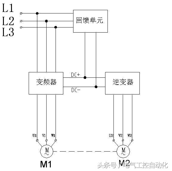 为解决以上问题,这里介绍了一种共用直流母线方式的再生能量回馈系统,通过这种方式,可以将制动产生的再生能量进行充分利用,从而起到既节约电能又处理再生电能的功效。