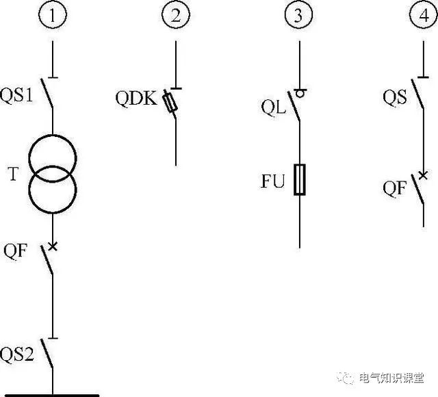 根据变压器高压侧情况的不同,可以选择如图2-44所示的4种开关电器。当电源侧继电保护装置能保护变压器且灵敏度满足要求时,变压器高压侧可只装设隔离开关①;当变压器高压侧短路容量不超过高压熔断器断流容量,而又允许采用高压熔断器保护变压器时,变压器高压侧可装设跌落式熔断②或负荷开关—熔断器③,一般情况下,在变压器高压侧装设隔离开关和断路器④。