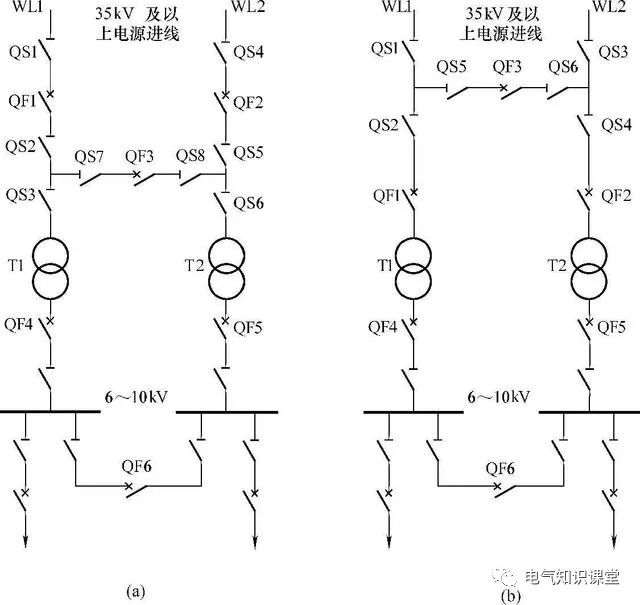 (1)内桥式主接线。内桥式主接线如图2-46(a)所示。线路WL1、WL2来自两个独立电源,经过断路器QF1、QF2分别接至变压器T1、T2的高压侧,向变电所供电,变压器回路仅装隔离开关QS3、QS6。当线路WL1发生故障或检修时,断路器QF1断开,变压器T1由线路WL2经桥接断路器QF3继续供电。