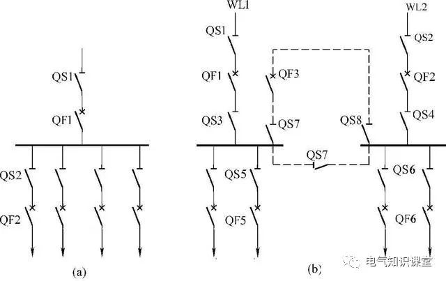 (1)单母线不分段接线。当只有一路电源进线时,常用这种接线,如图2-45(a)所示,每路进线和出线装设一只隔离开关和断路器。靠近线路的隔离开关称线路隔离开关,靠近母线的隔离开关称为母线隔离开关。单母线不分段接线的优点是接线简单清晰,使用设备少,经济性比较好。缺点是可靠性和灵活性差,当电源线路、母线或母线隔离开关发生故障或进行检修时,全部用户供电中断。此种接线适用于对供电要求不高的三级负荷用户,或者有备用电源的二级负荷用户。