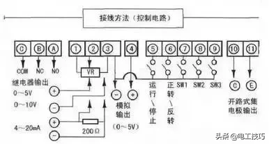 三、控制电路的接线 变频器的控制电路大体可分为模拟和数字两种 1、控制电路端子的接线应使用屏蔽线或双绞线,而且必须与主回路,强电回路(含200V继电器程序回路)分开布线。 2、由于控制电路的频率输入信号是微小电流,所以在接点输入的场合,为了防止接触不良,微小信号接点应使用两个并联的节点或使用双生接点。 3、控制回路的接线一般选用0.3~0.75平方米的电缆。