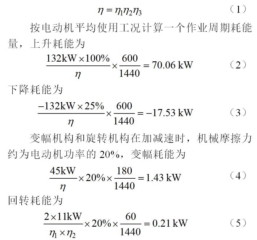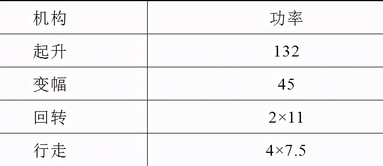 以某公司同一型号、同一规格的两台大型平头塔式起重机为例,最大额定起重质量为100t,起升高度为100m,工作级别M5,一个工作循环时间约为24min,上升一次10min,下降10min,增幅90s,减幅90s,回转60s,行走使用频率极低,可忽略不计,各机构电动机功率见表1。