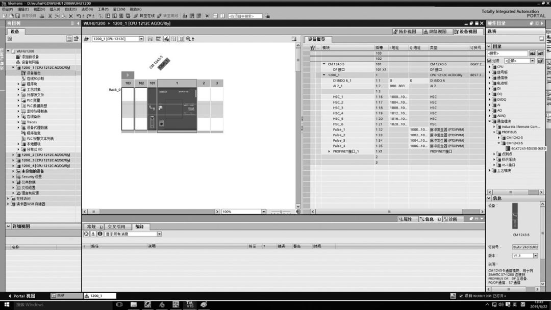 (4)添加硬件模块——在设备视图中,我们可以看见已经添加过的1200CPU。在右侧硬件设备目录树中,我们需要找到我们需要的1200DP 主 站通讯卡, 订货号为6GK7 243-5DX30-0XE0,找到此设备,然后将设备拖动到CPU 左侧的101 插槽中,鼠标双击DP 九针接口处,然后此处可以创建一下我们需要的DP 子网, 这里我们例子名称为PROFIBUS 1200_1(此处可以根据需要修改项目需要的子网名称)然后保存项目,如图4 所示。