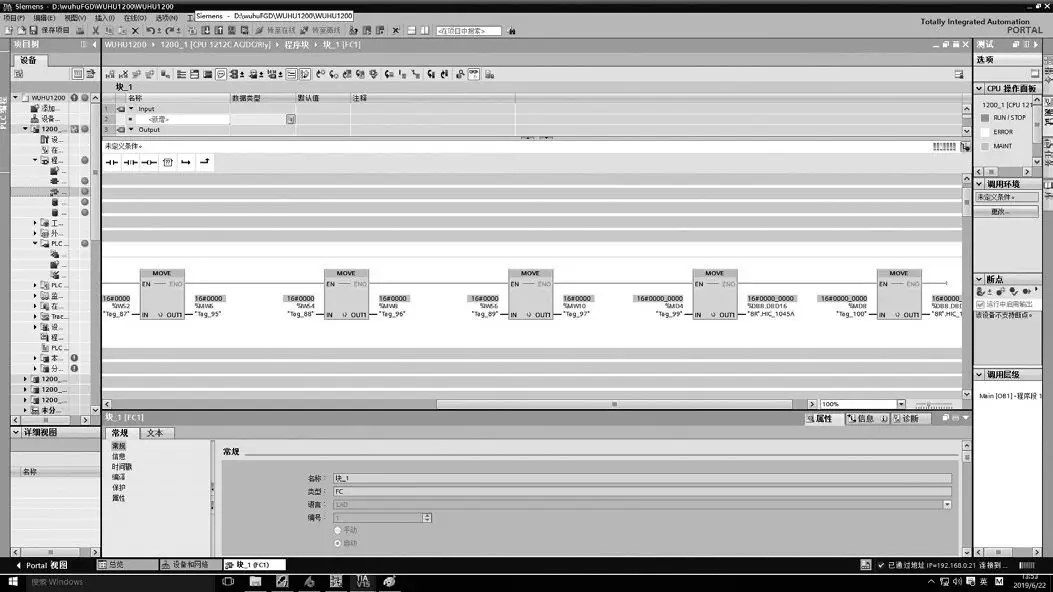 创建一个FC1 功能,将FC1 插入到OB1 运行组当中,由于我们选择不压缩模式,所以变频器例子当中的QW54,QW56 两个word 格式的字对应的是我们变频器的频率写入,IW50,IW52 两个word 格式的字对应的是我们变频器的状态字,IW54,IW56 两个word 格式的字对应的是我们变频器的频率反馈,我们无法直接将数据写入到DB 块当中,此处我们需要转换一下,才可以将这些word 格式的数据转换到我们需要的DB 共享数据块当中,这里面我们使用MOVE 来将数据转换到我们需要的