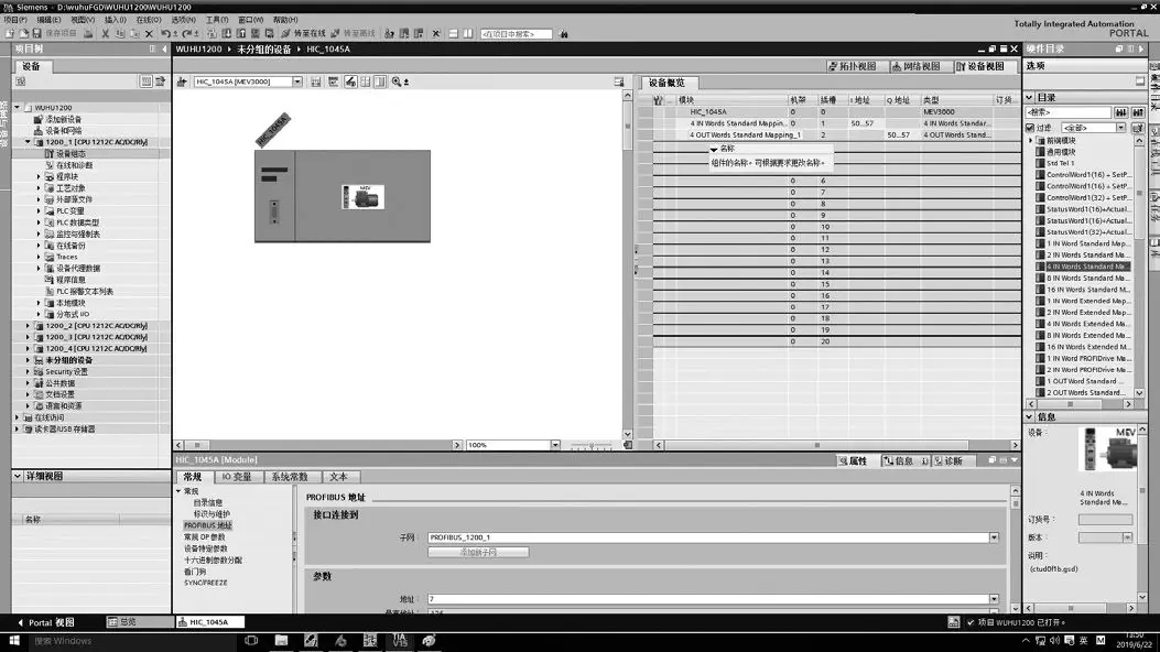 (7) 双击我们已经添加完成的GSD 文件,在设备视图中,我们可以看见MEV3000 变频器相关内部配置,由于MEV3000 基本上所有的参数配置都在现场变频器上修改参数,内部类似于局部参数号字数,菜单参数号等都不需要设置,我们需要从左侧硬件目录中选择添加4 INWORDS STANDARD MAPPING 以及4OUT WORDS STANDARD MAPPING 在插槽1 和2 中,然后回到网络视图中,此时MEV3000GSD 文件上面会写着“未分配”, 点击MEV3000 的GSD 文件“ 未分配” 文字, 选择PROFIBUS 1200_1,此时MEV3000 已经与我们的1200CPU通过TIA Portal V15 软件通过DP 网络连 接完成,点击设备上的DP 连线接触点,然后设置1200CM1243-5 的DP 地址以及MEV3000 变频器地址,地址不可以一样,否则会有冲突。此处我们设置1200CM1243-5 主站DP 地址是2,MEV3000 变频器从站是7。然后设置波特率,波特率此处推荐是19200KB/S,然后在插槽1 和2 中4 IN WORDS STANDARD MAPPING 以及4OUT WORDS STANDARD MAPPING 填写我们需要IN/OUT 所映射的变频器地址。此例子我们选择IN 地址为iw50-iw57,OUT 地址为Qw50-Qw57,如图7 所示。