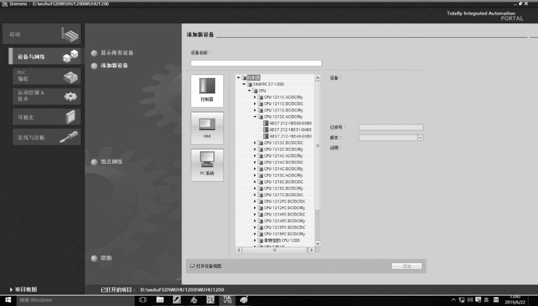 (3)在PLC 中添加项目——在项目视图中,在树形目录下,双击添加新设备。然后在弹出窗口( 控制器下) 中找到正确的PLC 并使用CPU,然后选择OK将设备添加到项目中。此处选择的1200CPU 订货号为6ES7 212-1BE40-0XB0,如图3 所示。