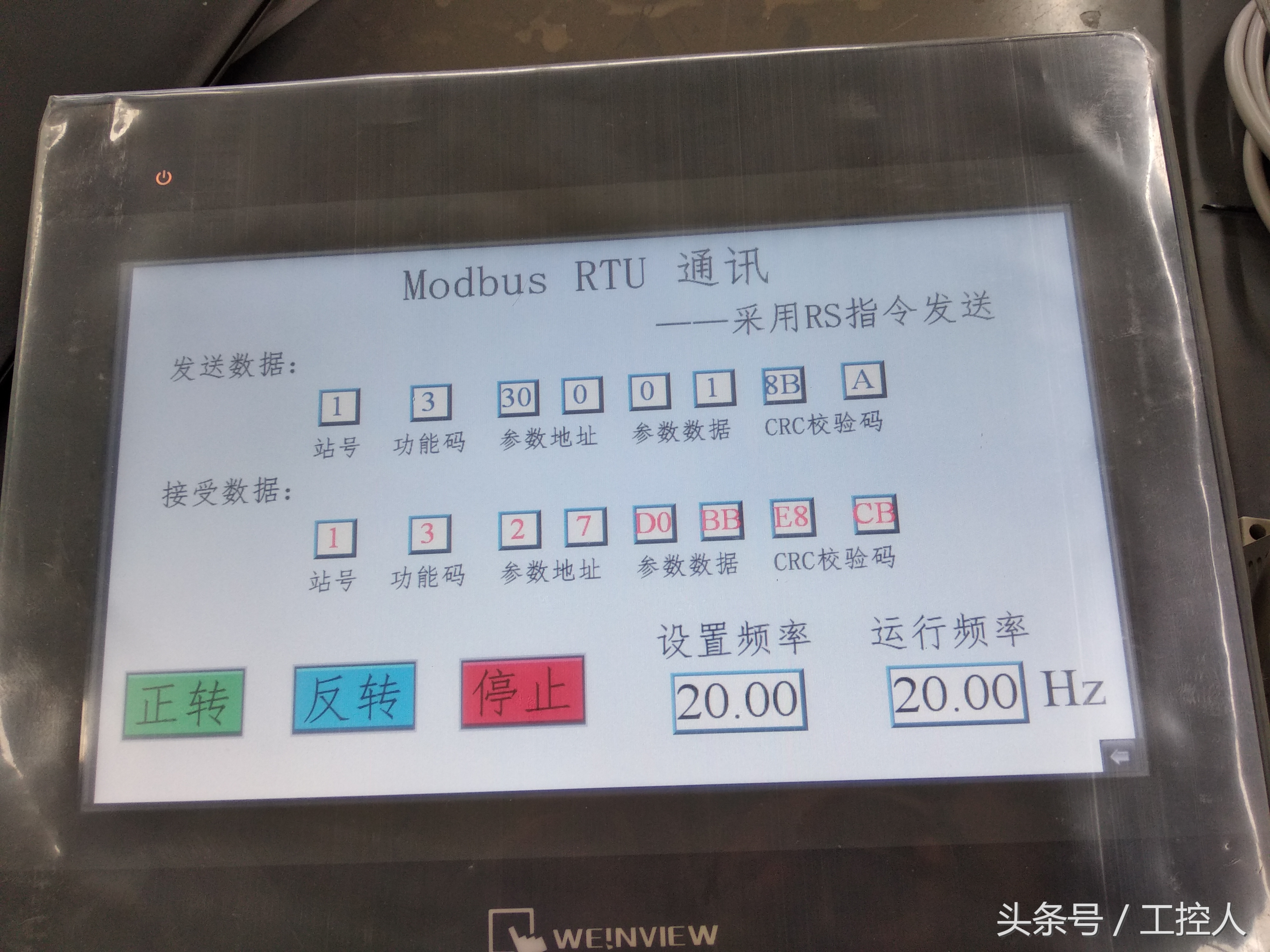 由变频器手册知道通讯控制的地址为2000H, 正转数据位0001H, 反转是0002H, 停机是0005H。
