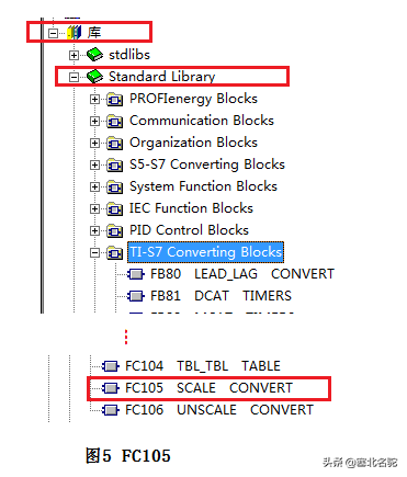 - 模拟量数据的处理,是通过调用FC105来实现的。FC105是标准库中的"块",它专门用于对模拟量进行标准化处理的,如图5所示。