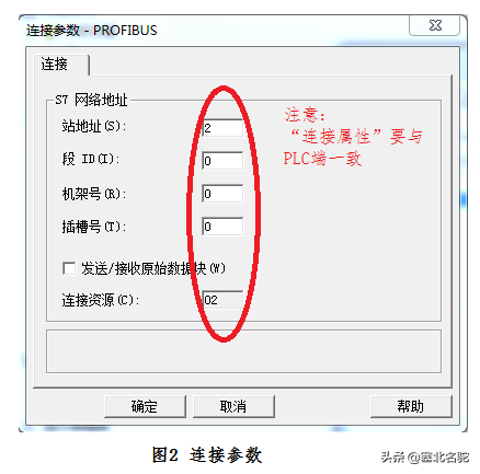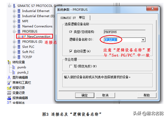 需要注意的是,在做通讯组态的时候,连接参数要与PLC侧保持一致,如图2所示。"逻辑设备名称"要与"Set PG/PC"中设定的一致,如图3所示。