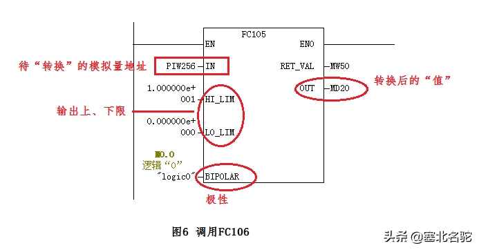 FC105可以在OB1中调用,但更常用的是在OB35(循环中断)中调用(本例中在OB1中调用),如图6所示。