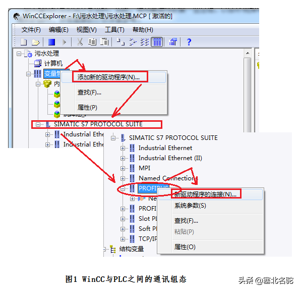 在WinCC端组态与S7系列PLC之间的通讯步骤如下(如图1所示): - 右键点击"变量管理",选择"添加新的驱动程序";