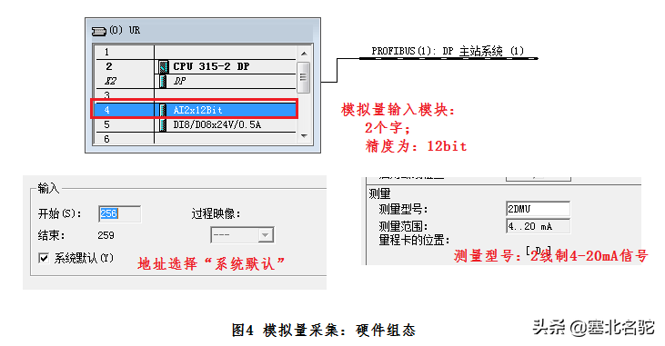 二、PLC端模拟量的采集与处理模拟量的采集通过模拟量输入模板完成,其硬件组态如图4所示。
