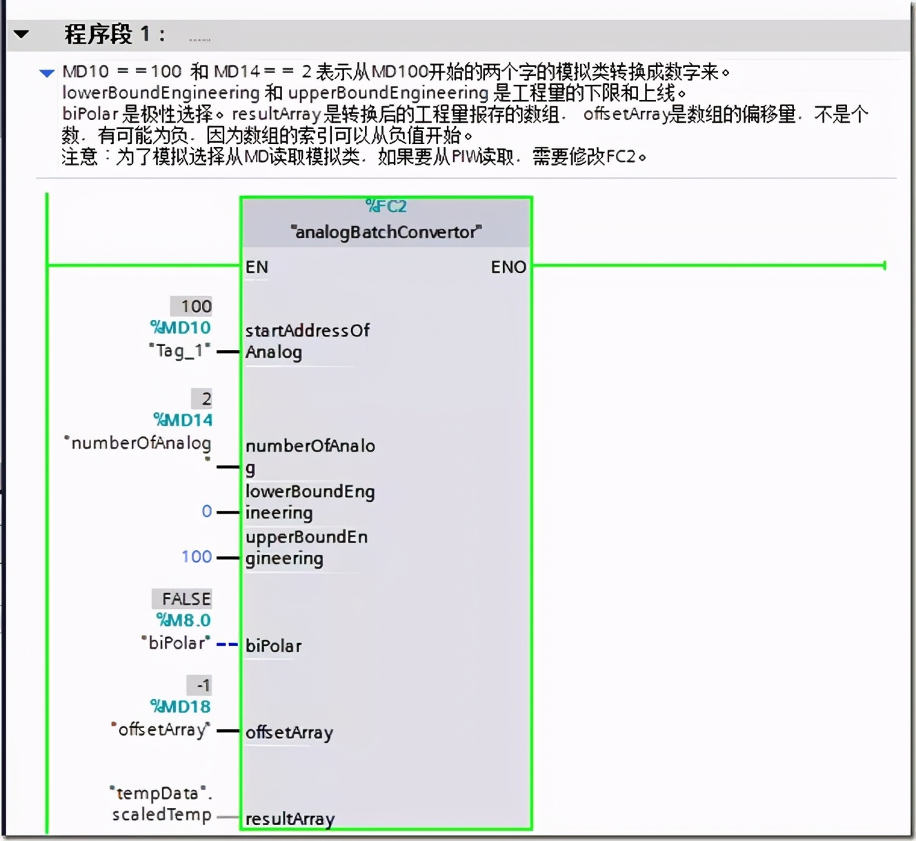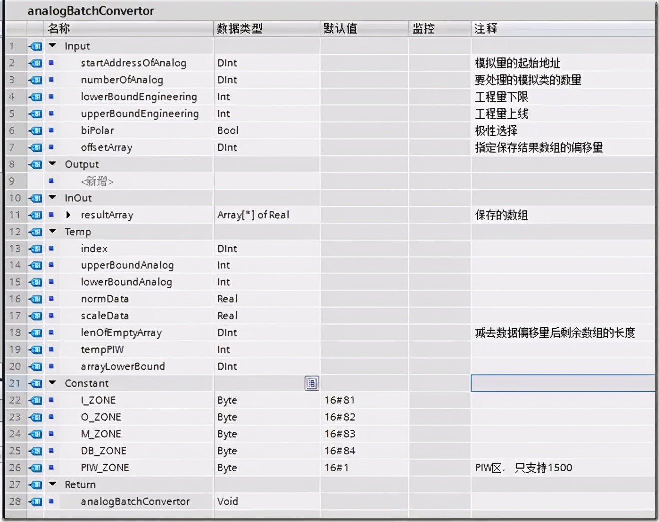 博途的间接寻址和S7-300/400大不一样。博途中的间接寻址主要用peek/poke指令,peek/poke指令不能用于优化的数据块。优化数据块可以用数组类寻址。这次的控制任务是模拟类的批量处理,s7-300/400模拟量批量处理很繁琐。 控制任务把数量不定的模拟量转换成工程量,然后保存到指定的数据块中。这里我们为了测试,不读取PIW中的模拟值,而用MW代替。