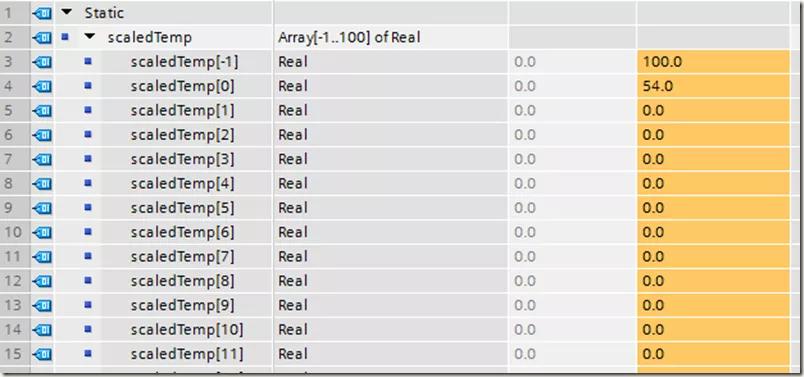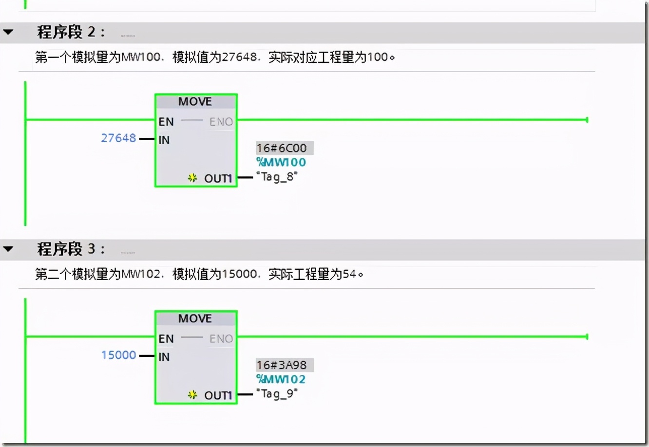 最后,模拟量转化为工程量后为100.0 和 54.0,存入数据块。