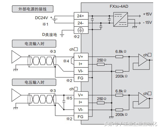 FX3U可编程后面第一个扩展输入模块,第二个模拟量输入模块(模块地址:单元号0)  FX3U-4AD接线端子排