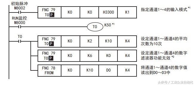 *1. 请设计输入模式设定后,经过5秒以上的时间再执行各设定的写入。 但是,一旦指定了输入模式,是被停电保持的。此后如果使用相同的输入模式,则可以省略输入模式 的指定以及T0 K50的等待时间。 *2. 数字滤波器的设定使用初始值时,不需要通过顺控程序设定。 4).传送顺控程序, 确认数据寄存器的内容。 1). 请传送顺控程序,运行可编程控制器。 2) .将4AD中输入的模拟量数据保存到可编程控制器的数据寄存器(D0~D3)中。 3). 请确认数据是否保存在D0~D3中。