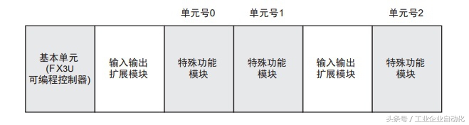 5. 模拟量数据读出 关于使用4AD读出模拟量数据时,所需的最低限度的程序,就此进行说明。 请用下列内容确认是否正确读出了模拟量数据。 1).确认单元号。 从左侧的特殊功能单元/模块开始,依次分配单元号0~7。 连接在FX3U-32MT可编程控制器上时,分配1~7的单元编号。 请确认分配了哪个编号。