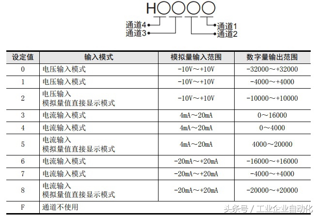 2).决定输入模式(BFM #0)的内容 请根据连接的模拟量发生器的规格,设定与之相符的各通道的输入模式(BFM #0)。 用16进制数设定输入模式。请在使用通道的相应位中,选择下表的输入模式,进行设定。