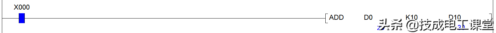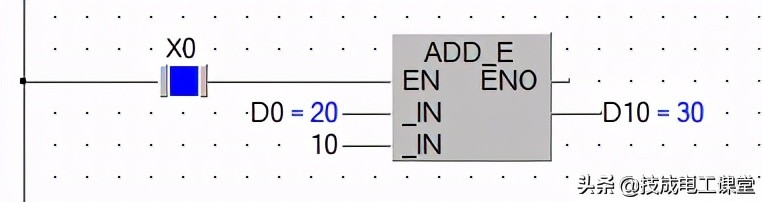 它可以通过功能指令实现,也可以运用功能块实现。如下图27-5所示为功能指令形式,X0接通,(D0)=K20,执行ADD指令后,D10的当前值为“和”K30。  图27-5