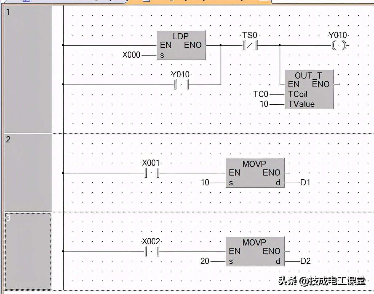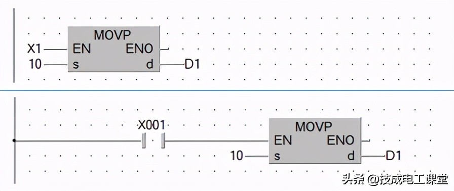 而功能块和功能指令,若是对于一般的功能而言,其实两者区别不大,例如我们要实现两个数的相加:当驱动条件X0成立时,把D0的当前值加上K10,结果保存到D10中。