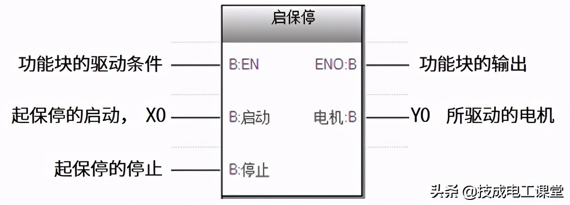 例如电机的起保停程序,我们可以把整个起保停程序打包成一个功能块,如下图27-2所示,该功能块的输入输出、起保停的启动、停止和电机都以标签的形式定义,直到被调用时再由用户指定具体的软元件,如起保停的启动用“X0”、电机用“Y0”等。  图27-2