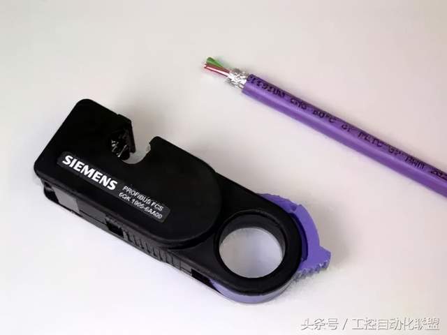 图1. 剥好一端的PROFIBUS电缆与快速剥线器(FCS,订货号6GK1905-6AA00)。 B. 打开PROFIBUS网络连接器。首先打开电缆张力释放压块,然后掀开芯线锁。