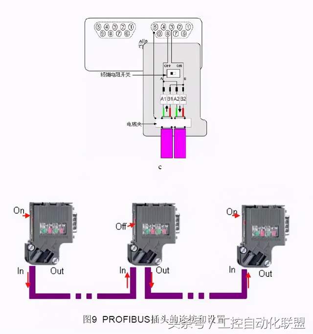 一、PROFIBUS-DP线的正确接法普及 正确接法如下图,不用解释,看图就明白。PROFIBUS 电缆很简单的,就只有两根线在里面,一根红的一根绿的,然后外面有屏蔽层。接线的时候,要把屏蔽层接好,不能和里面的电线接触到。要分清楚进去的和出去的线分别是哪个,假如是一串的,就是一根总线下去,中间不断地接入分站,这个是很常用的方法。在总线的两头的两个接头,线都要接在进去的那个孔里,不能是出的那个孔,然后这两个两头的接头,要把它们的开关置为ON状态,这时候就只有进去的那个接线是通的,而出去的那个接线是断的。其余中间的接头,都置为 OFF,它们的进出两个接线都是通的(记忆方法:ON表示接入终端电阻,所以两端的接头拨至ON;OFF表示断开终端电阻,所以中间的接头要拨至 OFF)。