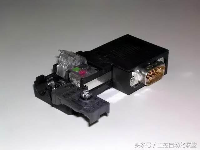 图2. 打开的PROFIBUS连接器 C. 去除PROFIBUS电缆芯线外的保护层,将芯线按照相应的颜色标记插入芯线锁,再把锁块用力压下,使内部导体接触。应注意使电缆剥出的屏蔽层与屏蔽连接压片接触。