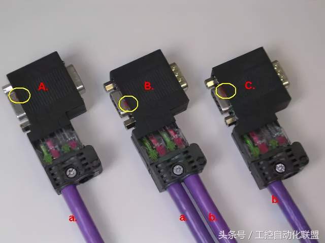图5. 总线型网络连接 在上图中,网络连接器A、B、C分别插到三个通信站点的通信口上;电缆a把插头A和B连接起来,电缆b连接插头B和C。线型结构可以照此扩展。 注意圆圈内的“终端电阻”开关设置。网络终端的插头,其终端电阻开关必须放在“ON”的位置;中间站点的插头其终端电阻开关应放在“OFF”位置。