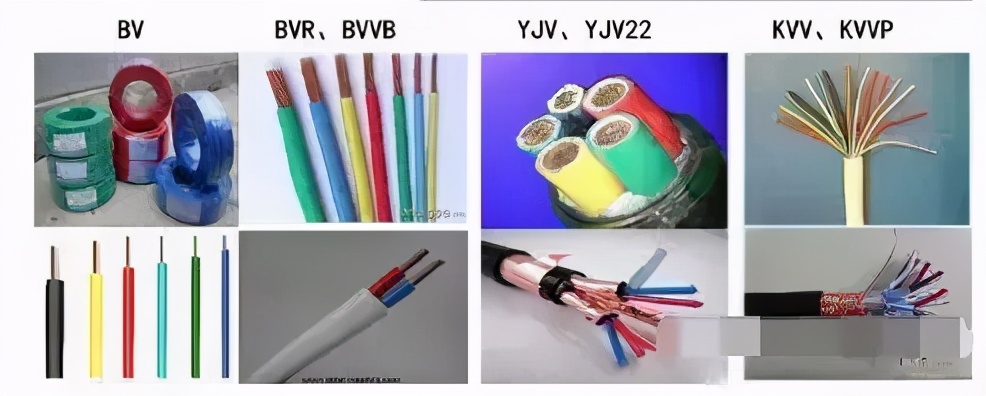 聚氯乙烯绝缘电线:BV、BLV、BVR、BVVB、BLVVB等俗称布电线,电压等级450/750V。 聚氯乙烯绝缘电缆:VV、VLV、VV22、VLV22。电压有0.6KV~110KV等多种。 交联聚乙烯绝缘电缆:YJV、YJLV、YJV22、YJLV22等. 控制电缆:KVV、KVV22、KVVP、KYJV等,主要用于电器间的电路连接与控制。 阻燃电缆、耐火电缆:ZR、NH