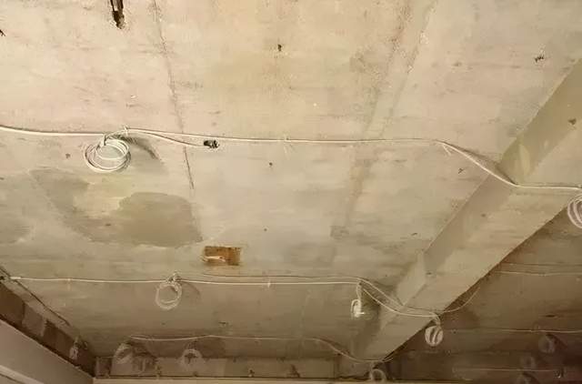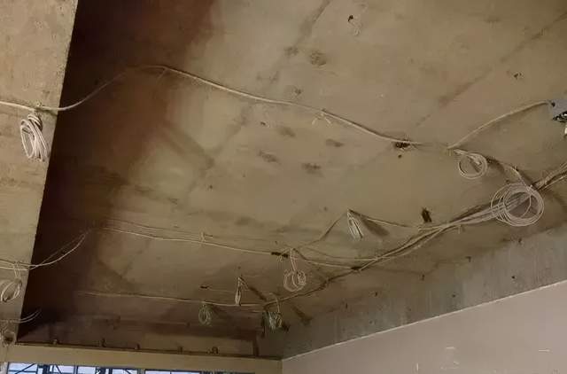 通常,电工先行,布线时会将电线绑扎在混凝土天花板的最上面,这样后期不会干扰发到其他工人施工,也不会返工。强弱电同时布线间隔最少要150mm以上的距离。