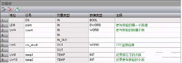 西门子S7-200SMART系列PLC的程序结构分为主程序、子程序、中断程序。此程序用“MAIN”程序调用“CRC校验程序”子程序 定义子程序变量表:如图1-0