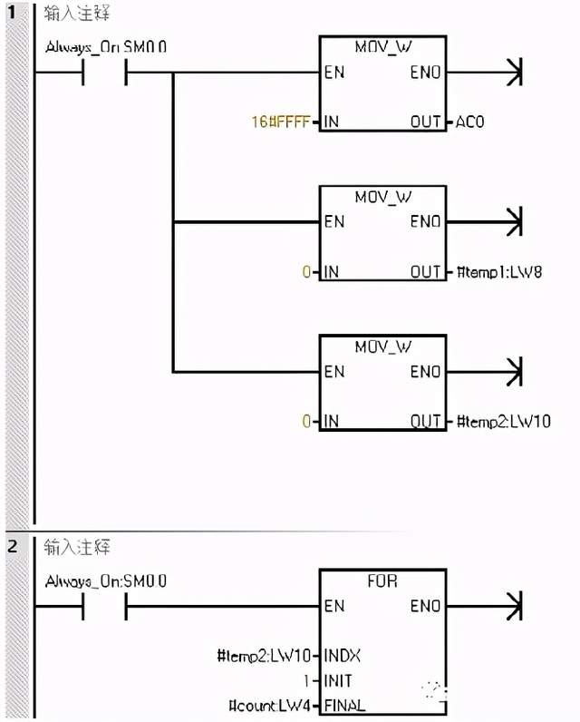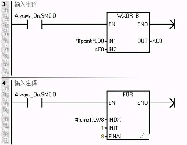 (1)“CRC校验程序”子程序,初始化存储器,并把16#FFFF装载到CRC寄存器中(定义AC0为CRC寄存器)。并利用FOR语句循环,循环的次数由LW4决定。程序如图1-1所示