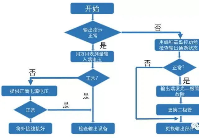 在诊断输入/输出故障时,最佳方法是区分究竟是模块自身的问题,还是现场连接上的问题。如果有电源指示器和逻辑指示器,模块故障易于发现。通常,先是更换模块,或测量输入或输出端子板两端电压测量值正确,模块不响应,则应更换模块。若更换后仍无效,则可能是现场连接出问题了。