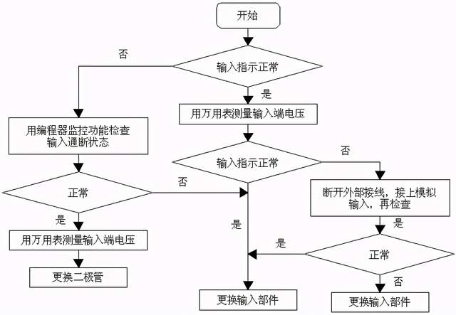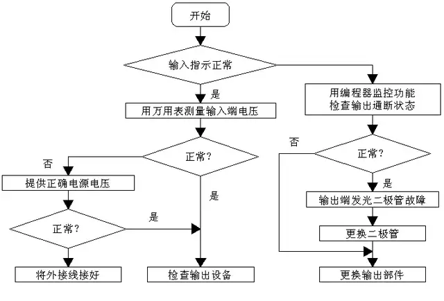 4、输入输出故障检查 输入输出是PLC与外部设备进行信息交流的信道,其是否正常工作,除了和输入输出单元有关外,还与联接配线、接线端子、保险管等组件状态有关。图7.13和图7.14分别所示的是输入检查流程和输出检查流程。